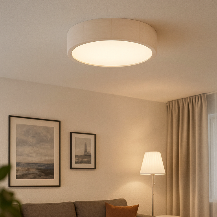 • Das Gehäuse der Deckenleuchte besteht aus Holz und geätztem (Satin-) Glas, was eine gleichmäßige Lichtverteilung gewährleistet.
